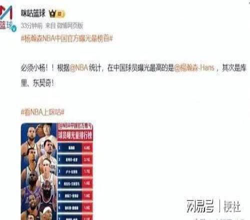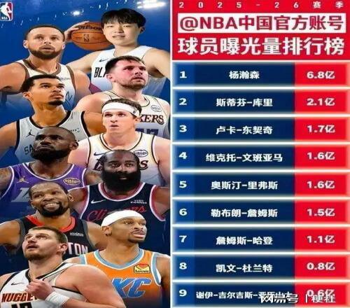 数字背后的中国热度 NBA中国发布的榜单中,第一名是拥有中国国籍的杨瀚森。他的曝光量不仅断层领先,还远远超过了库里的曝光量。