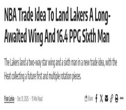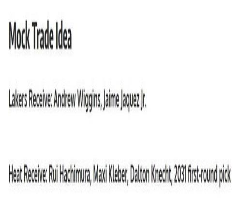 潜在交易方案如下 湖人得到:维金斯+小海梅; 热火得到:八村垒+克莱贝尔+克内克特+2031年首轮签。