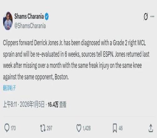 右膝韧带受伤!至少休战6周!快船遭遇沉重打击