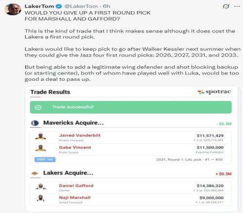 湖人媒体Laker Tom写道:你们愿意放弃一个首轮签来换马绍尔、加福德吗?这笔交易我认为是合理的,尽管湖人会失去一个首轮签。 佩林卡希望保留2026年的选秀权,他们希望能有机会追逐凯斯勒,届时湖人可以出2026年、2027年、2031年、2033年四个首轮签。但如果湖人能引进一位合格的侧翼3D球员与一名擅长封盖的替补内线,而这些球员都跟卢卡有默契,这无疑是一笔非常划算的交易不容错过。
