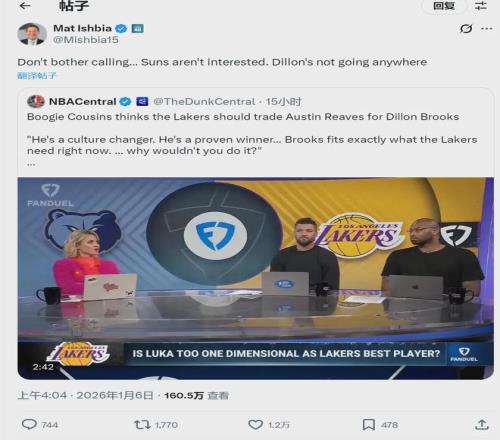 | 北京时间1月6日,前NBA球星考辛斯在节目中说:“湖人应该用里夫斯去换狄龙。狄龙能改变球队文化,是一位久经考验的赢家,完全符合湖人的需求!”太阳老板Mat Ishbia转发回应:“别费劲打电话了,太阳没兴趣交易,狄龙哪儿都不去!”
