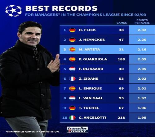 | 欧冠联赛阶段第7轮,阿森纳客场3-1击败国米。据德国转会市场网站统计,在执教欧冠至少25场的主帅中,阿尔特塔场均积分仅次于弗里克和海因克斯。